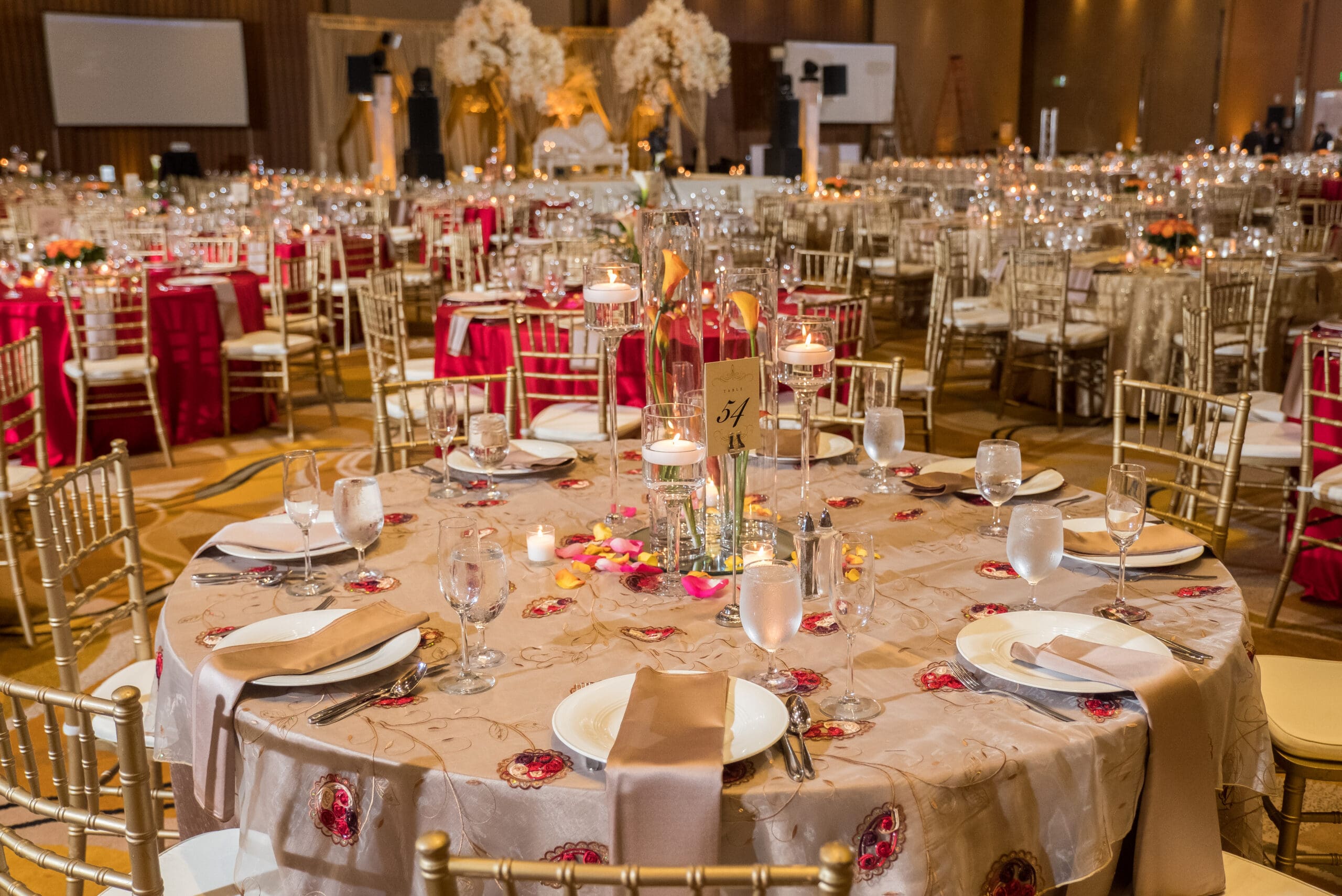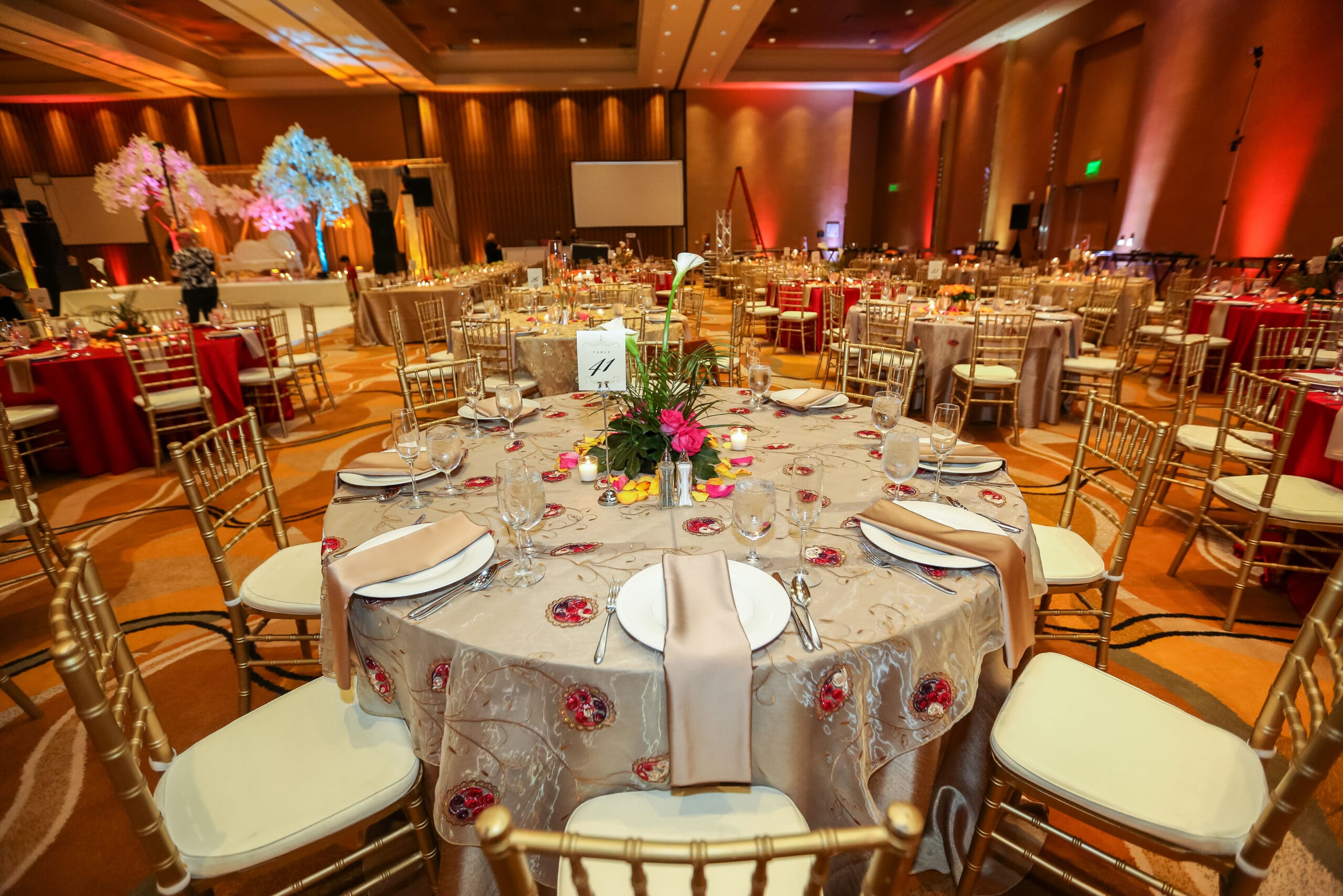 Round tables dressed in gold chiavari chairs, layered linens, and coordinated centerpieces allow the space to feel cohesive from every angle. Even with a large guest count, the layout remains organized and symmetrical. Wide walkways and clear sightlines ensure the stage and focal points remain visible from anywhere in the room.